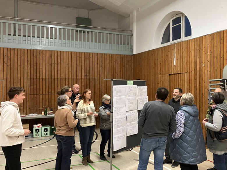 „Miteinander reden“: Ein letztes Mal kommen engagierte Menschen aus Odernheim in der Turnhalle zusammen, um die Ideen für mehr Raum und Sicherheit im Straßenverkehr zu diskutieren. So entsteht ein Stimmungsbild zu den vorgeschlagenen Maßnahmen – von kleinen Verbesserungen bis zu größeren Projekten. Die Ideen sind in mehreren, von unserem Büro begleiteten Workshops entstanden. Jetzt wird der Maßnahmenkatalog dem Gemeinderat übergeben. Wir sind gespannt, wie es in den nächsten Monaten und Jahren in Odernheim weitergeht!