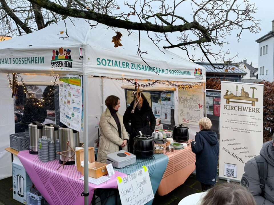 Es weihnachtet sehr! Unser Quartiersmanagement-Team nutzt zum Jahresabschluss noch einmal zwei Gelegenheiten, ins Gespräch zu kommen und seine Arbeit vorzustellen: Während des Fests der GWH in der Henri-Dunant-Siedlung bastelt das Team gemeinsam mit Kindern und Erwachsenen Sterne aus alten Ästen. Eine Premiere gibt es auf dem Kirchberg: Erstmals teilt sich das Team seinen Stand mit Kirchwerk, Nachhaltigkeit Lernen in Frankfurt und JugendBildung e. V. Vom morgendlichen Suppekochen bis zum Abbau – hier packen viele Hände mit an. Auch so wächst Zusammenhalt!