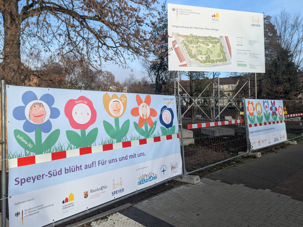 Bunte Bauzaunbanner: Vorfreude pur! Ein Verfügungsfondsprojekt sorgt rund um den Feuerbachpark und die Melchior-Hess-Anlage für Farbe und positive Akzente. Wegen der laufenden Bauarbeiten fehlen aktuell nutzbare Grünflächen und Spielangebote. Um die Übergangszeit bis zur Neueröffnung im Sommer zu überbrücken, wurden von Kindern aus dem Stadtteil gestaltete Bauzaunbanner angebracht. Unter dem Motto „Speyer-Süd blüht auf!“ zeigen sie Selbstporträts als farbenfrohe Blüten. Gleichzeitig rücken die Banner die Städtebauförderung stärker ins Blickfeld.