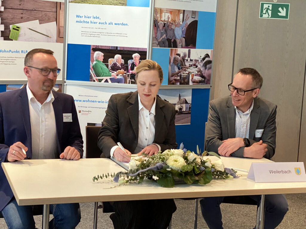 Gemeinschaftliches Wohnen weiterdenken: Sozialministerin Dörte Schall unterzeichnet die Kooperationsvereinbarung zwischen Land und Kommune im Programm „WohnPunkt RLP – Wohnen mit Teilhabe“. Der aktive Inklusionsbeirat plant innovative Wohnangebote und Teilhabe im vertrauten Umfeld. Seit 2021 stehen wir Kommunen in Rheinland-Pfalz als Partner bei ihren WohnPunkt-Projekten zur Seite. Dieses Jahr unterstützen wir die Verbandsgemeinde Weilerbach – voller Tatendrang, neue Ideen umzusetzen und gemeinsam Wirkung zu entfalten.